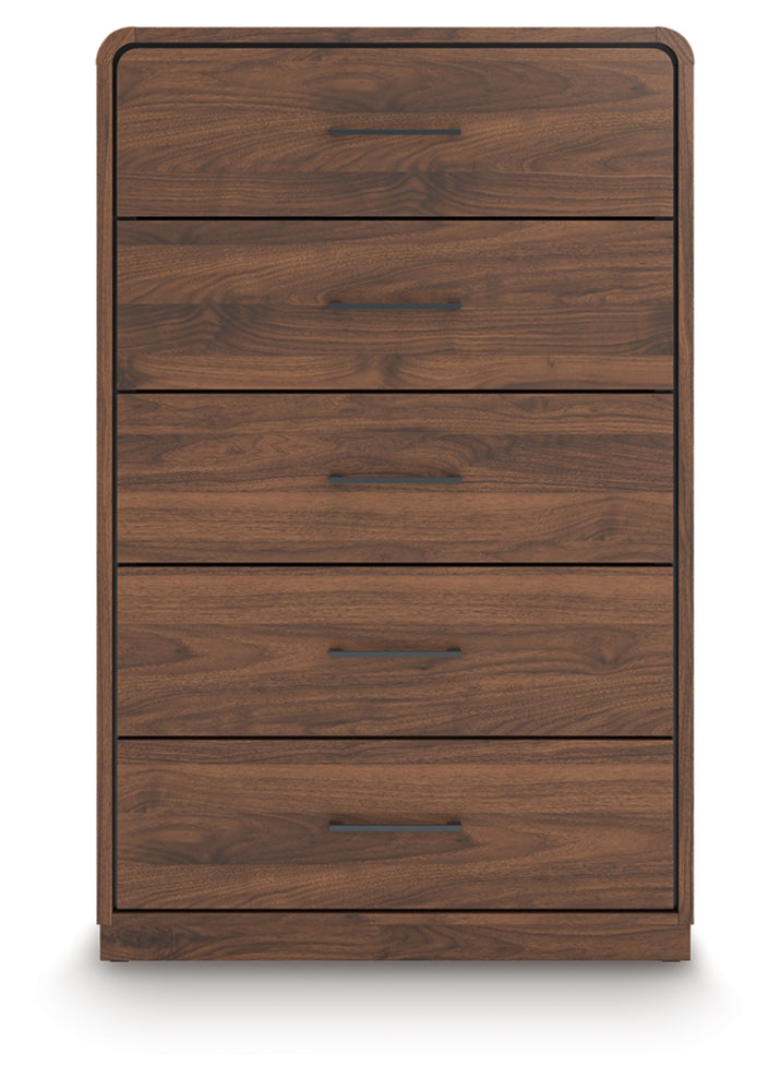 Grace your restful retreat with an added dose of refinement. This chest of drawers showcases a stunning rich brown wood tone, with sleek drawer pulls for an added layer of luxury. A rounded top softens the silhouette, elevating the look. It’s curated, contemporary and utterly chic.