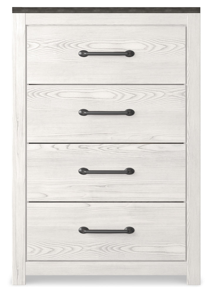 Cool, clean and casually modern. This chest’s wispy whitewash and gray finish sets the tone for your calming sanctuary. Large linear pulls add dimension and authenticity. Four smooth-gliding drawers neatly accommodate your wardrobe needs.