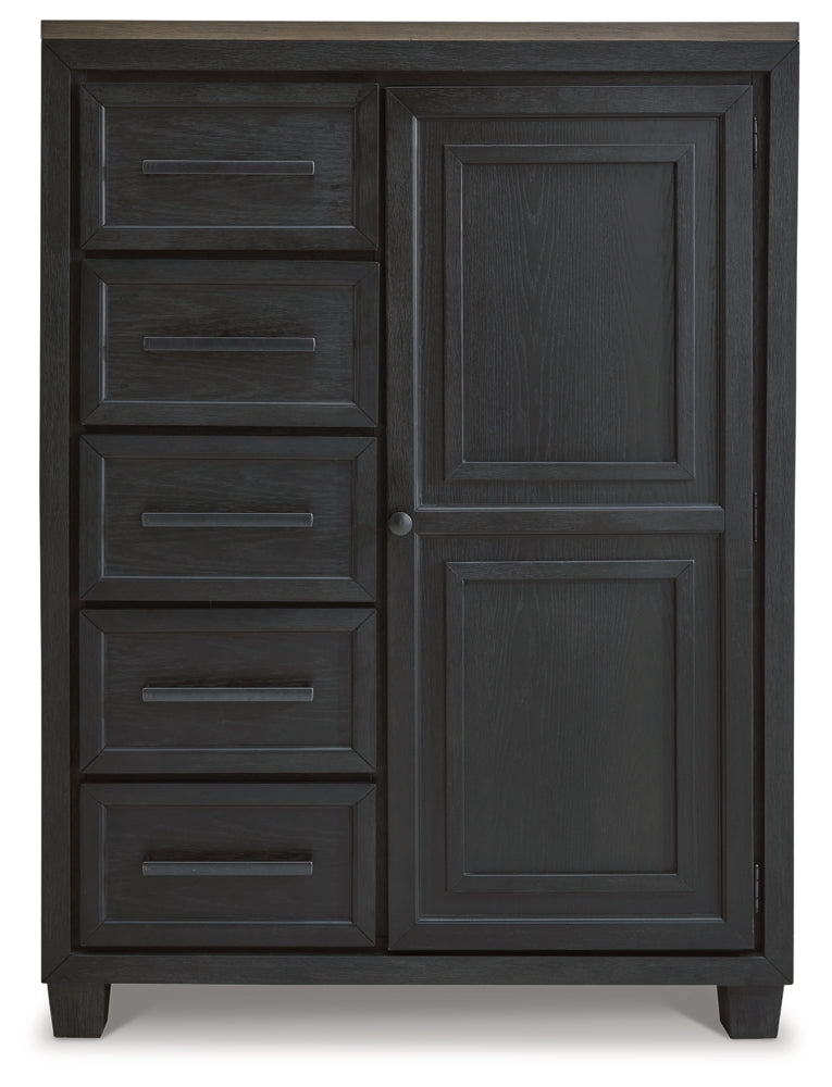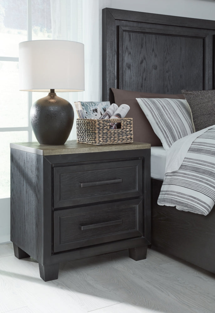 This bedroom package is casual contemporary style simply done right. Its two-tone color scheme features a rich brushed black main color accented with a beautiful dusty grayish brown wood tone. What a chic approach to relaxed yet refined design.