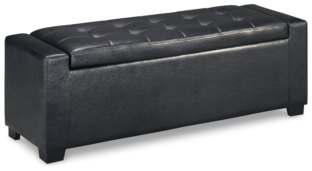 What a handsomely tailored upholstered storage bench. Black faux leather upholstery is elevated with button tufting. Lift the cushion to reveal ample storage for your pillows, throws and more.