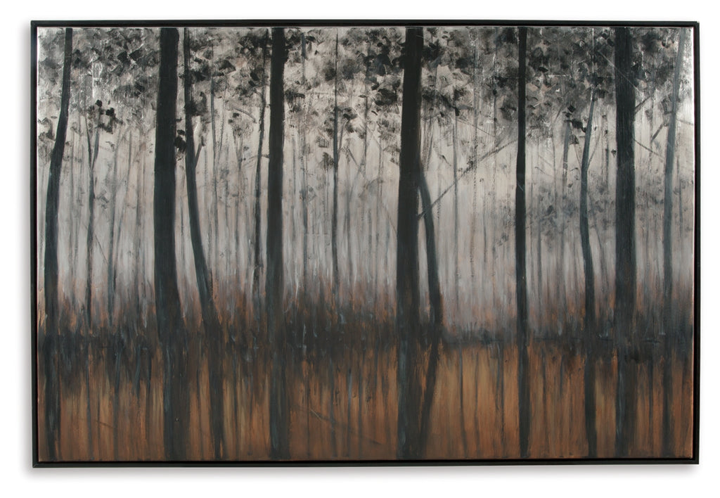 A mystery of trees captures our gaze in this textured wall art. Silver tinted trees reflect beautifully in an orange body of water. Hand-painted nature of the piece makes each one a unique work of art.