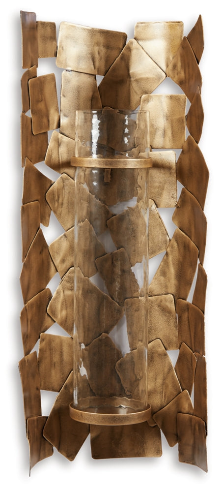 Light up your space with contemporary style with this wall sconce. The antiqued goldtone finish of the stacked shapes adds a classic element to this very modern piece. Add in your own candle and enjoy your very chic space.