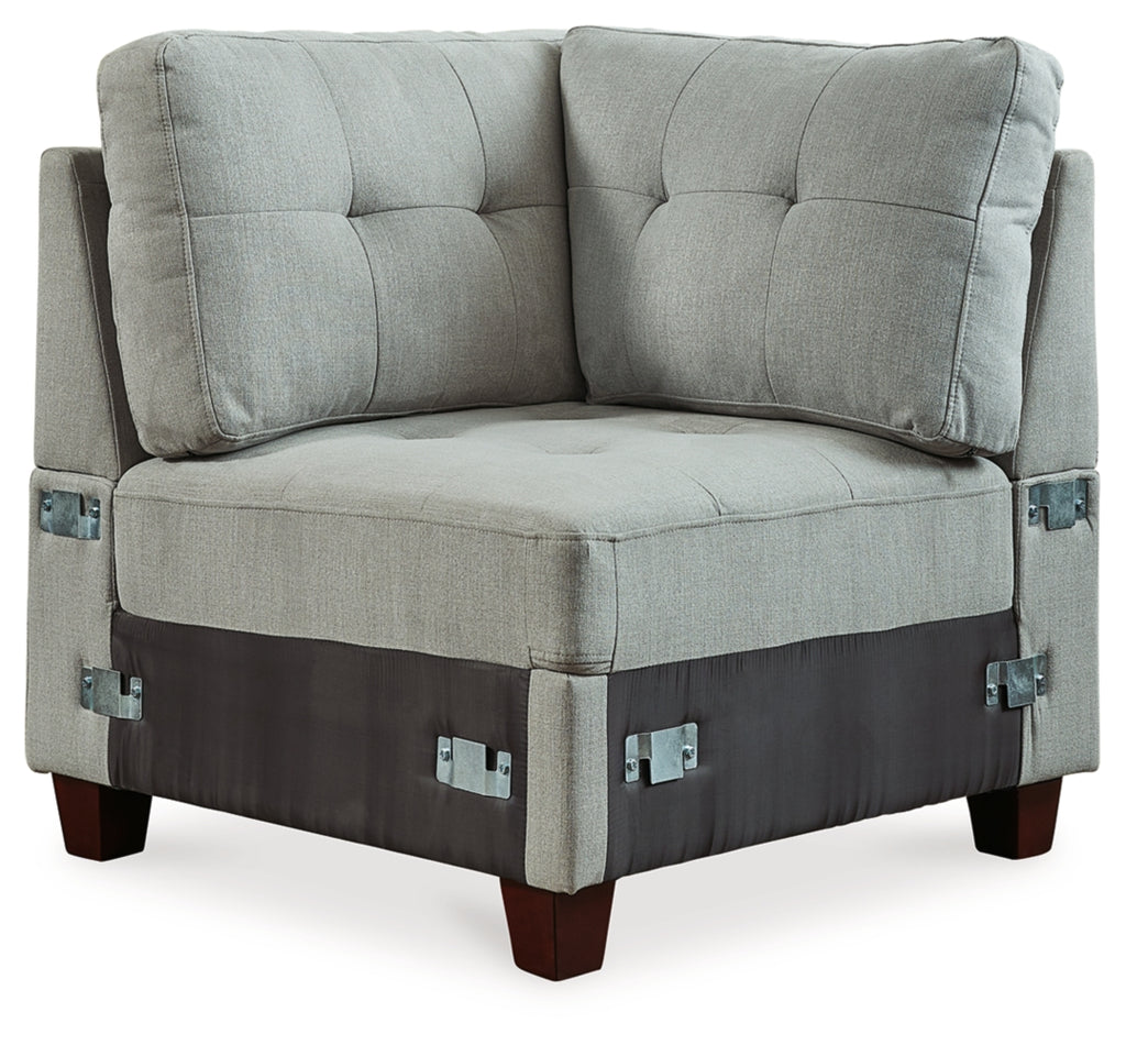 This wedge is made with polyester upholstery. Fully finished on all sides, it pairs with other items in the series to make a modular sectional.