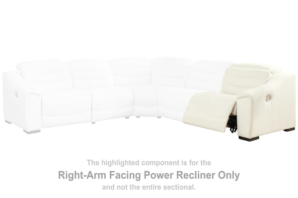 This right-arm facing power recliner is made with faux nubuck leather upholstery. Pairs with other items in the series to make a sectional.