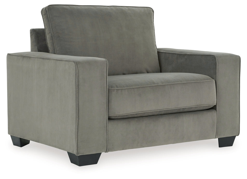 Serving up a refined, upscale look—at an incomparable value price—this chair lures from every angle. Crisp box cushioning, wide track arms and black tapered feet lend a clean, contemporary aesthetic. Velvety soft upholstery in a chic sandstone gray takes neutral to another level.