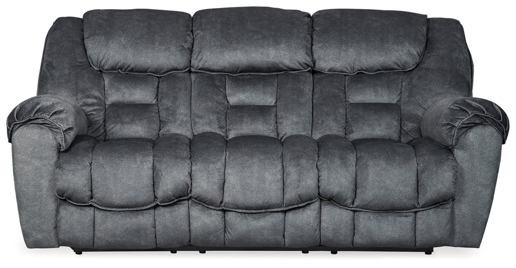 Sometimes seeing is believing. Rest assured this reclining sofa is every bit as indulgent as it looks. Designed to put you in the lap of luxury, this generously scaled reclining sofa—wrapped in a wonderfully plush and practical granite gray upholstery—sports scooped pillow wrapped armrests and curvaceously cushioned head-neck support for feel-good flair.