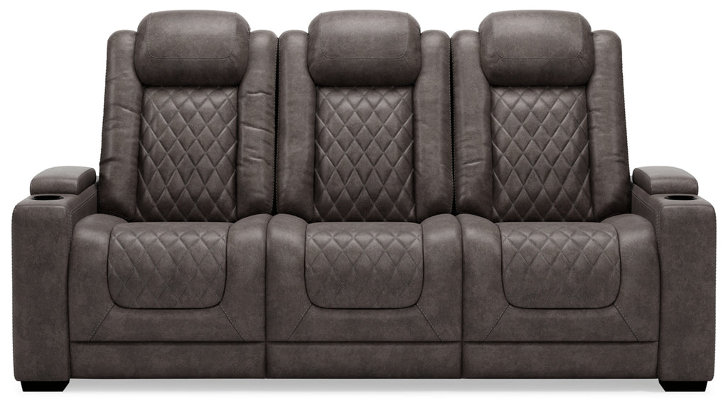 This power reclining sofa in trendy gray is proof of just how far recliners have come when it comes to form and function. Ultra cool and contemporary, this fully loaded power reclining sofa makes it so easy to social distance and make home your haven. Dressed to impress with diamond stitching inspired by sports car interiors, this reclining sofa is covered in a fabulous faux leather with pebbled effect for authenticity. High-tech advancements include a one-touch power control with Easy View™ adjustable headrest and USB plug-in and a drop-down table with cup holders, flip-up light and AC power/USB plug-ins.