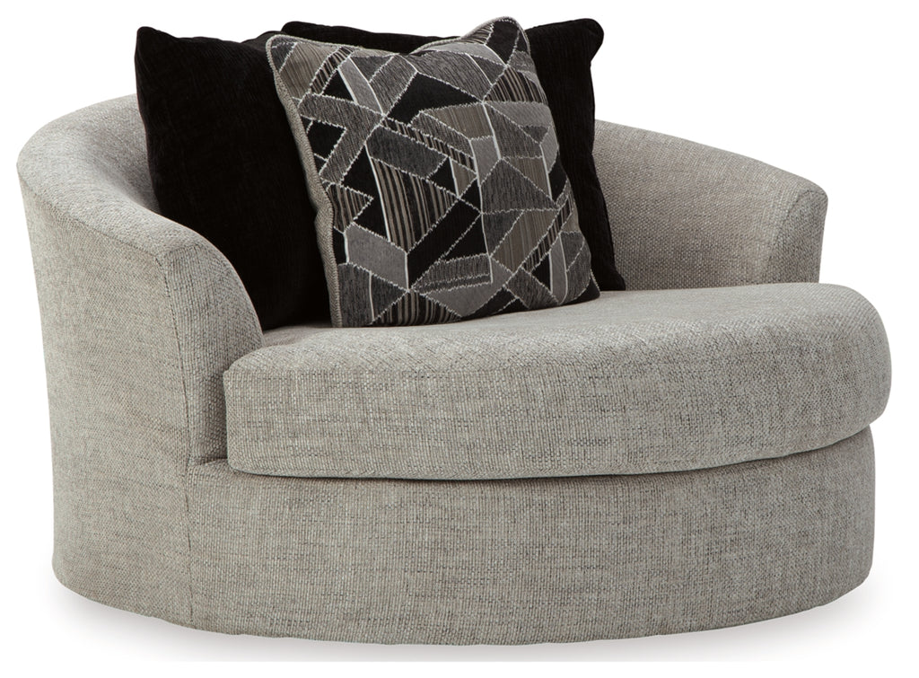 As much as you love clean-lined, modern furniture, you want to keep the vibe relaxed and comfortable. Rest assured, this oversized round swivel chair has that look and feel mastered. Perfect for fashion-forward family rooms, where everyone is welcome to kick back, this designer swivel chair will win everyone over with its head-turning flair. Richly textured, with specks of black and white peeking through, the chair’s storm gray upholstery is chic and sophisticated.