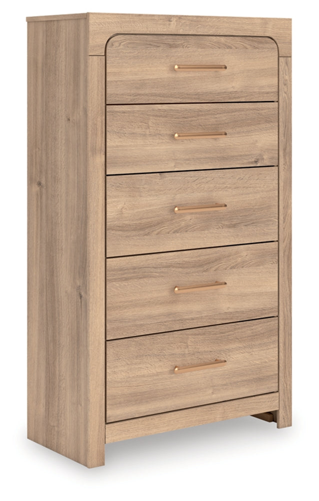 The natural wood tones and clean lines of this chest of drawers echo your easygoing style sensibilities. With a warm finish and replicated oak grain, its carefree character lightens up your bedroom. Curved inner corner details soften the look, while sleek bronze-tone hardware modernizes the feel.