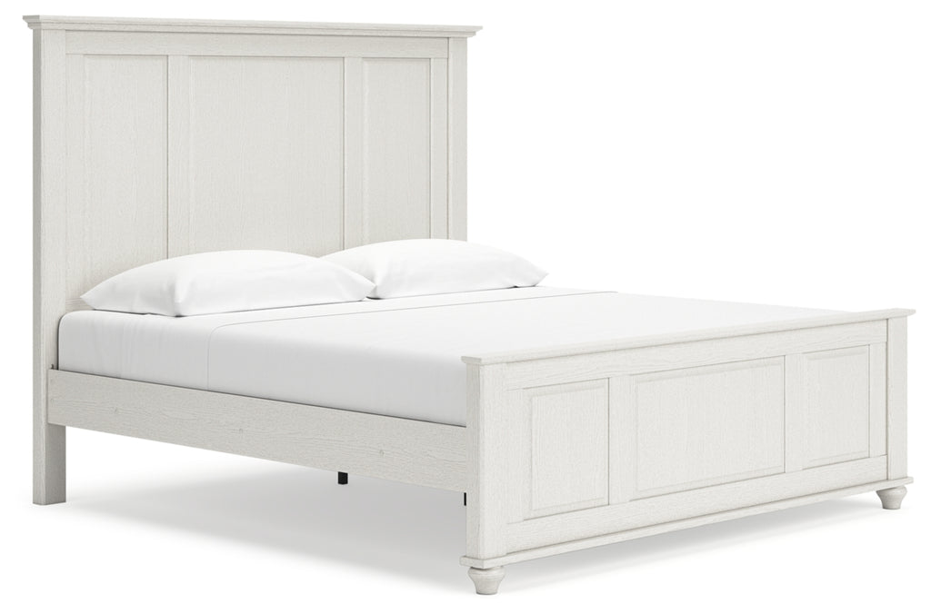 Brighten up your bedroom with this king panel bed. It delights with a soft white finish and cottage-quaint styling. Crown moulding and inset panels add dimension and a traditional touch. When done in the right color, even a simple design can take on a fashionable flair.