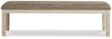 The beauty of this upholstered dining bench is something to savor. Serving up country cottage comfort and fresh farmhouse flair, the generously-scaled bench entices with a cushioned seat covered in a heavy woven fabric that complements the trendy textured, antiqued white finish.