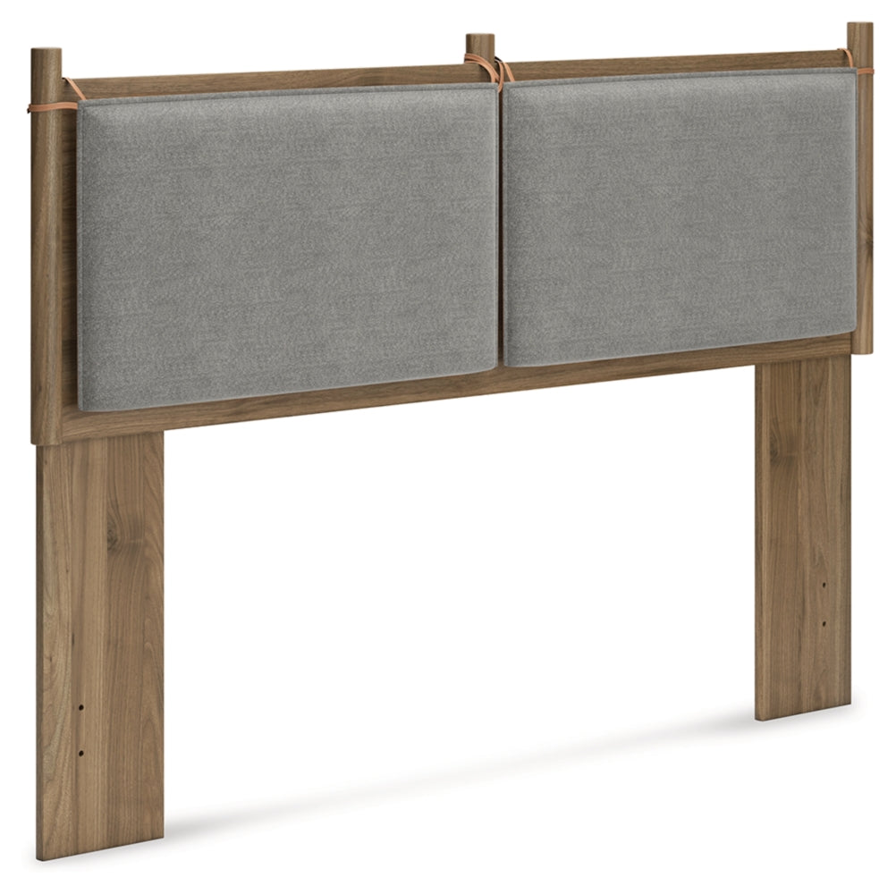 Dare to take minimalism to the max. This full panel headboard has a richly relaxed feel thanks to its honey brown finish over replicated wood grain. The optional reversible cushions are an inventive element, allowing you to choose faux leather or gray fabric to suit your space. There's no doubt about it: This contemporary piece is sure to become a classic.