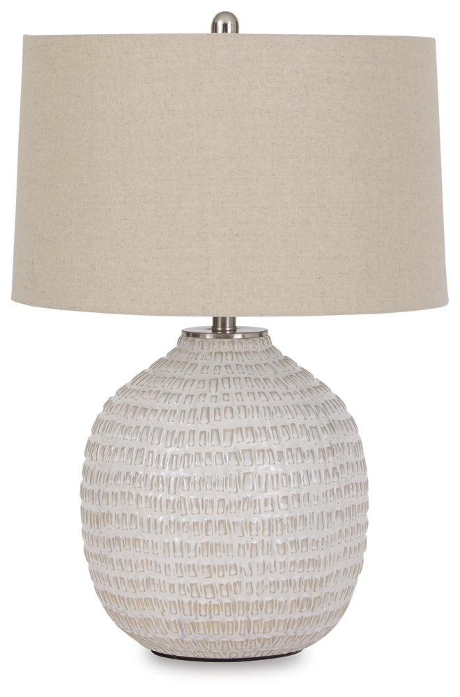 Style and function come together in this textured ceramic lamp to bring incandescent style to any space in your home. Combining a rounded base, accented with goldtone hardware, this lamp is capped off with a simple natural lampshade for complete elegance. Pair with a wide variety of furniture styles for a versatile indoor lighting option you'll love.