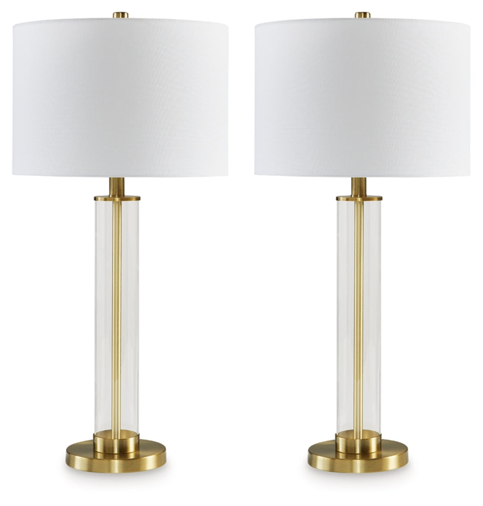 The body of this elegant table lamp has a contemporary flair, with a transparent glass cylinder that reveals a brass-tone rod inside. It's a minimal design made for maximal illumination.