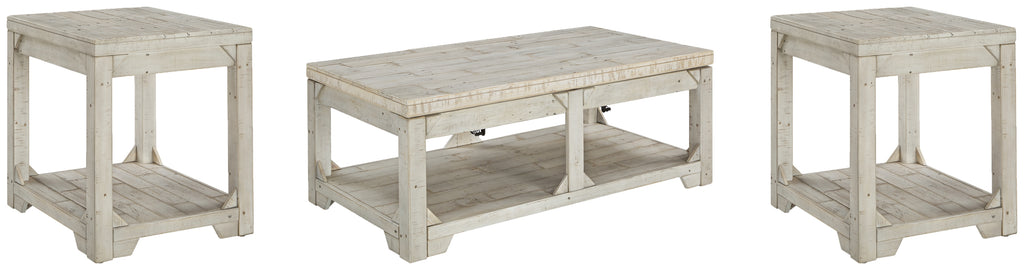 Take in the country fresh look of this occasional table set and reminisce of a simpler time. Its farmhouse style is evident in its stocky design with planked top/bottom shelf, unique triangle accents and relaxed white washed finish. You’ll love the casual feel and handcrafted look this ensemble brings to your living area. Plus, easy lift top feature accommodates eating or working in front of the television.