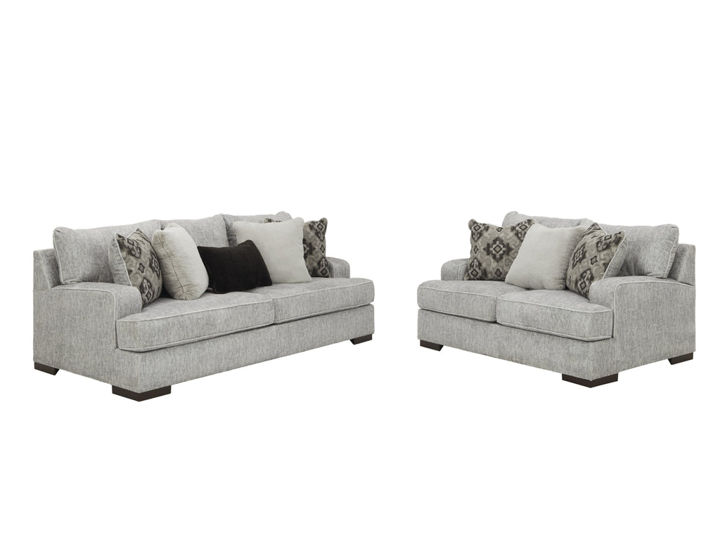 This 2-piece sofa and loveseat set with deep seats crafted for ultra-plush softness is the ideal merger of modern flair and classic staying power. If you love a touch of texture, you’re sure to appreciate this set's gorgeous gray upholstery with subtle chevron effect.