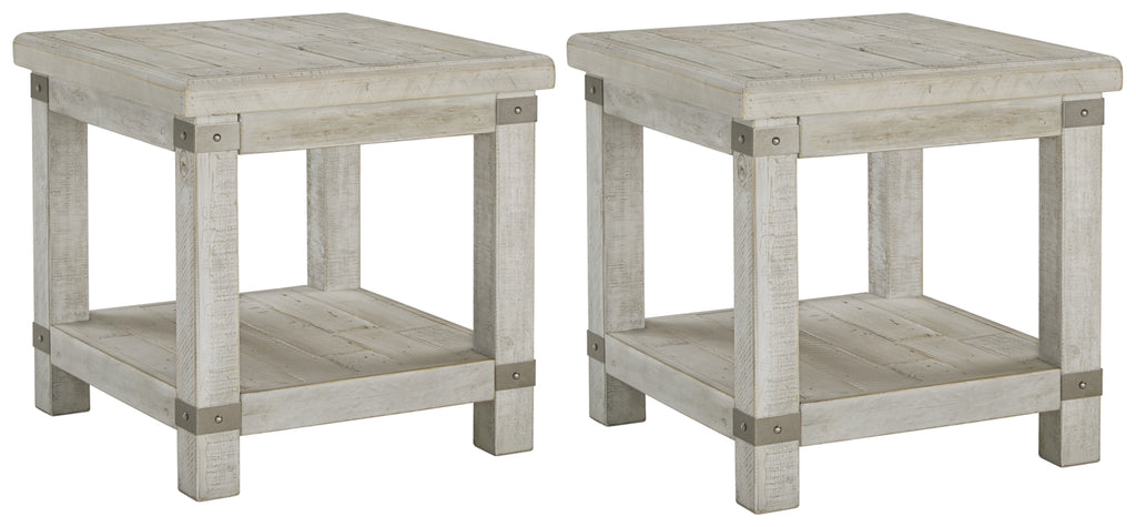 Add a quaint touch of farmhouse style to your living area with this 2-piece end table set. Its beautifully distressed light gray finish enhances the wood's natural grain, which delivers a naturally aged feel straight from the countryside. You'll love its generous scale, offering a roomy table top and base shelf that are ideal for displaying accents and more. Large legs, metal accents and the planked effect dress up its country charm.