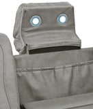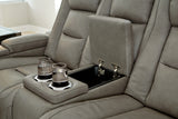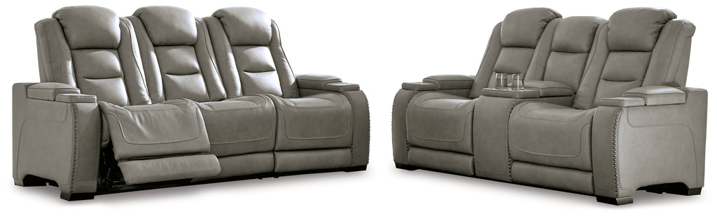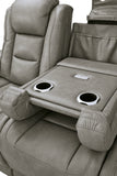 Reserved for him and made for her, this power reclining seating set in gray delivers all the comfort and style you could ask for. Inspired by sports car interiors, the combination leather and faux leather upholstery has a “perforated automotive” treatment for that much more appeal. An advanced one-touch power control puts you in the driver’s seat with an adjustable headrest and lumbar support, plus USB and wireless charging, all at your fingertips. Talk about fully loaded. And with integrated cup holders and hidden storage compartments under the posh, padded armrests, this designer reclining package makes the most of every inch of space.
