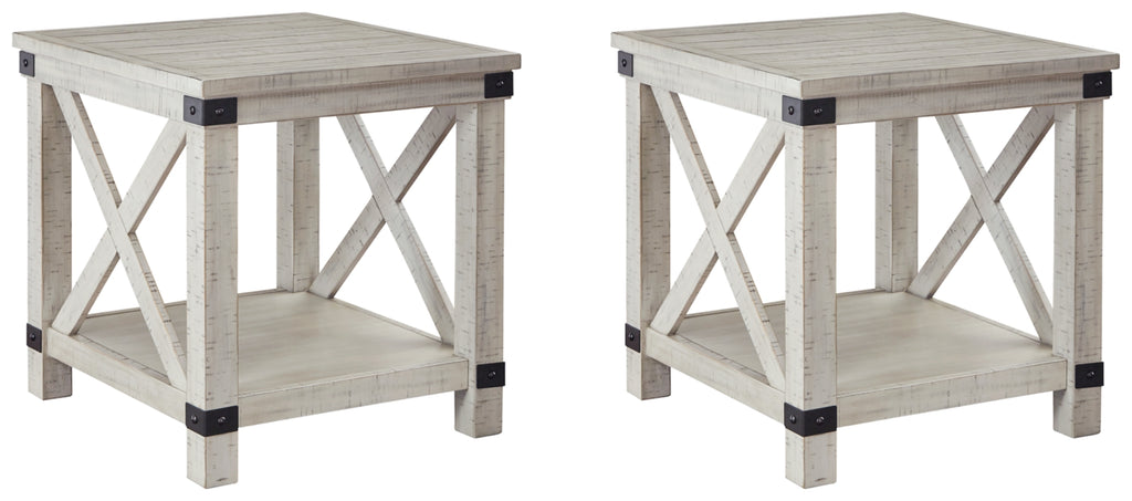 Sporting a distressed whitewash finish, this end table set is rustic farmhouse living at its best. Crossbuck styling adds striking flair. Metal industrial brackets incorporate an industrial twist.