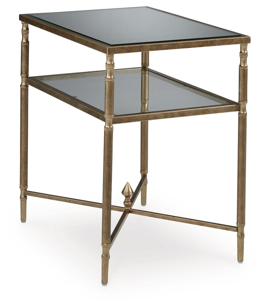 This end table gives traditional design a wonderful sense of relevance. Its details, which include embellished legs and a stretcher with a decorative center finial, are timeless classics. The aged goldtone coloration is the essence of relaxed elegance. An underlying shelf adds style, substance and functionality.