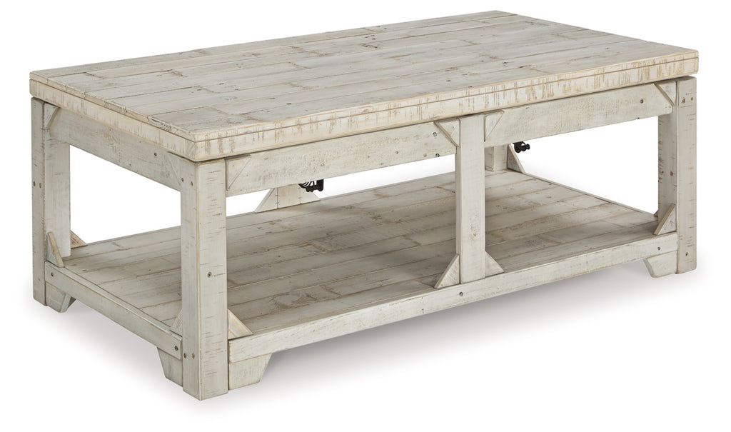 Take in the country fresh look of this lift top coffee table and reminisce of a simpler time. Its farmhouse style is evident in its stocky design with planked top/bottom shelf, unique triangle accents and relaxed white washed finish. With a handcrafted look thanks to reclaimed wood, you'll love the casual feel this piece brings to your living area. Plus, easy lift top feature accommodates eating or working in front of the television.