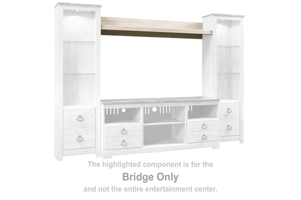 This bridge is made of engineered wood (MDF/particleboard/plywood) and decorative laminate. Pairs with other items in the series to make an entertainment center.