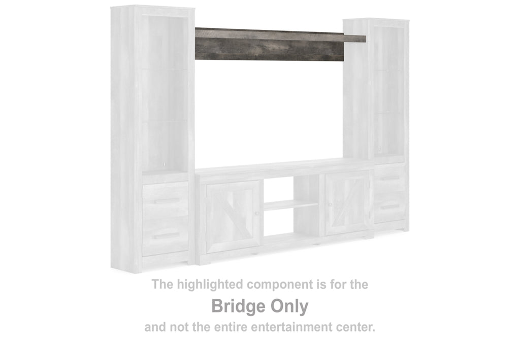 This bridge is made with engineered wood (MDF/particleboard/plywood) and decorative laminate. Pairs with other items in the series to make an entertainment center.